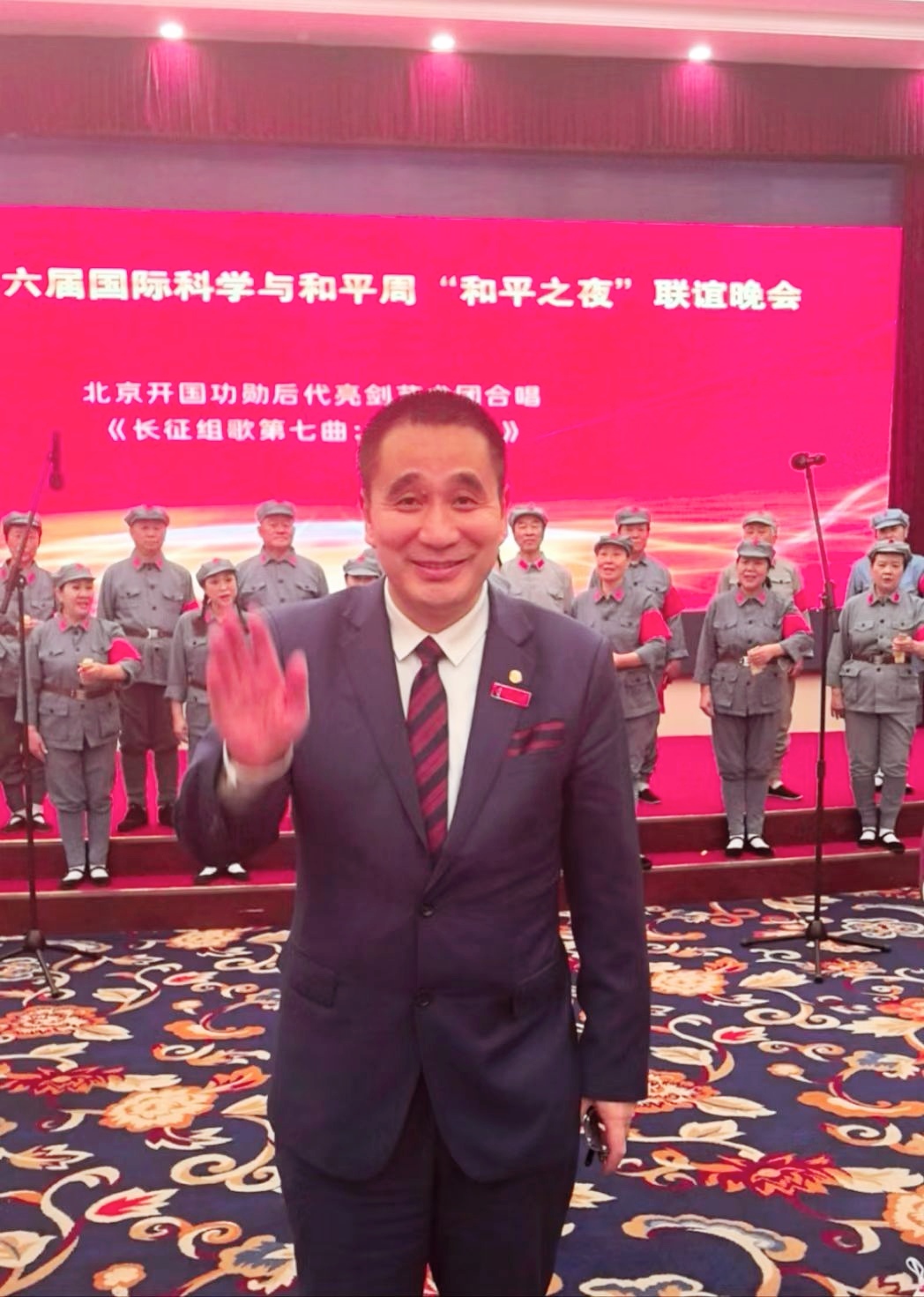 华国中代表中联国兴书画院向国际科学与和平周中国组委会赠送作品并发表精彩致词:科学、和平、发展是人类社会的永恒主题,是人类文明进步繁荣的基础。和平、和睦、和谐是中华民族5000多年来一直追求和传承的理念。中华民族是爱好和平的民族。和平、和合、和睦、和谐的追求深深植根于中华民族的精神世界之中,深深溶化在中国人民的血脉之中。让我们共同胸怀为人类谋进步的光荣伟大梦想,脚踏和平发展的人间正道,吸吮绵延不断的中华文明,中华民族同世界上一切爱好和平的民族携手共进,手拉手,心连心。向着人类命运共同体的光明大道阔步前行。