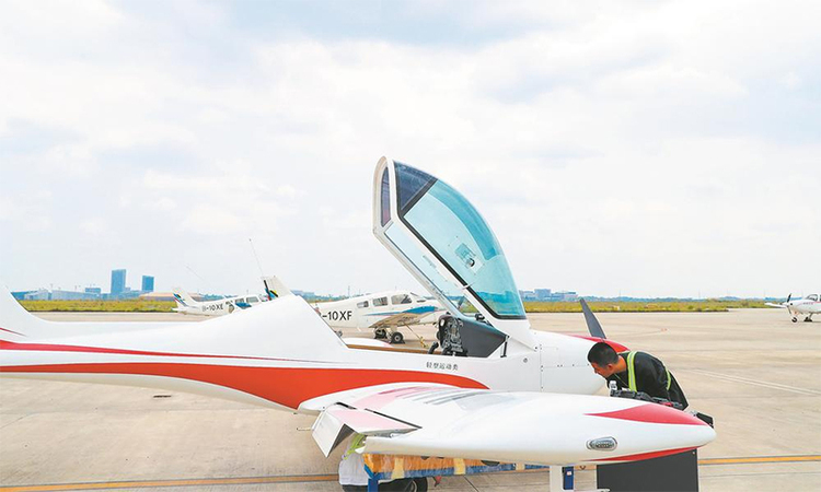 金堂淮州机场,地勤人员对轻型运动机进行例行保养