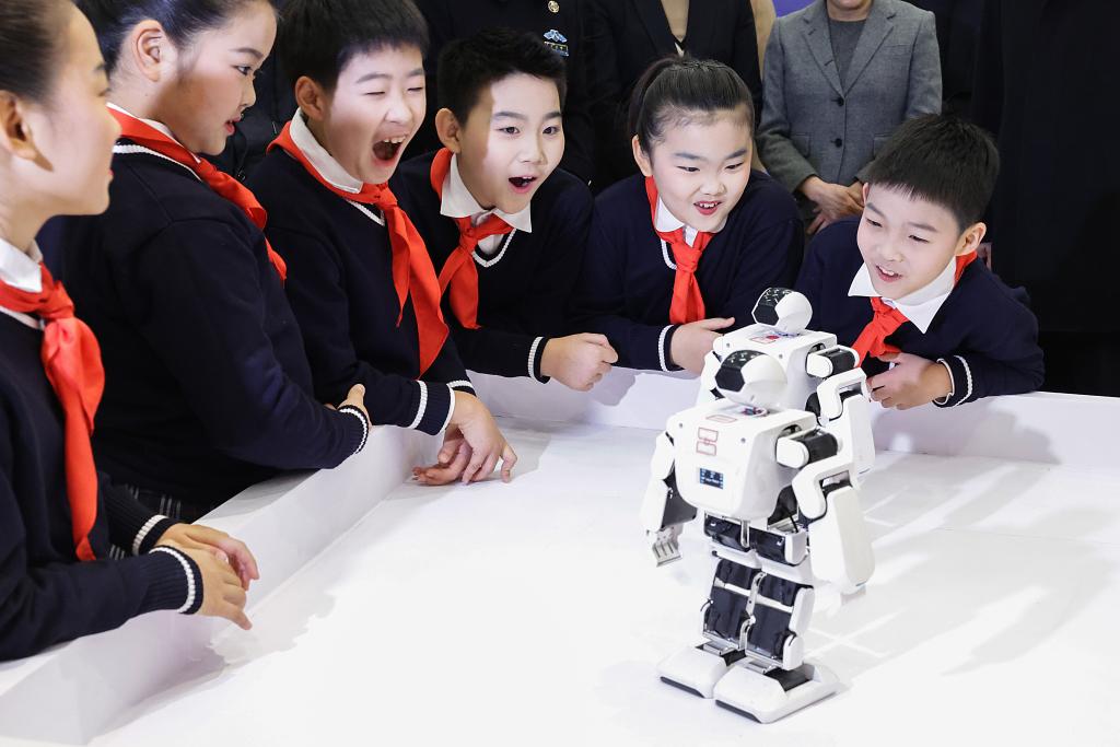 11月28日,一名小朋友在展览上体验围棋学习互动装置。