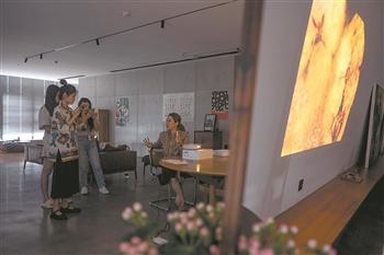 7月22日下午,李一慧公司红人“美妆小丸子”(图左)正在录制新一期的美妆视频,李一慧(图中)过来观看拍摄效果。