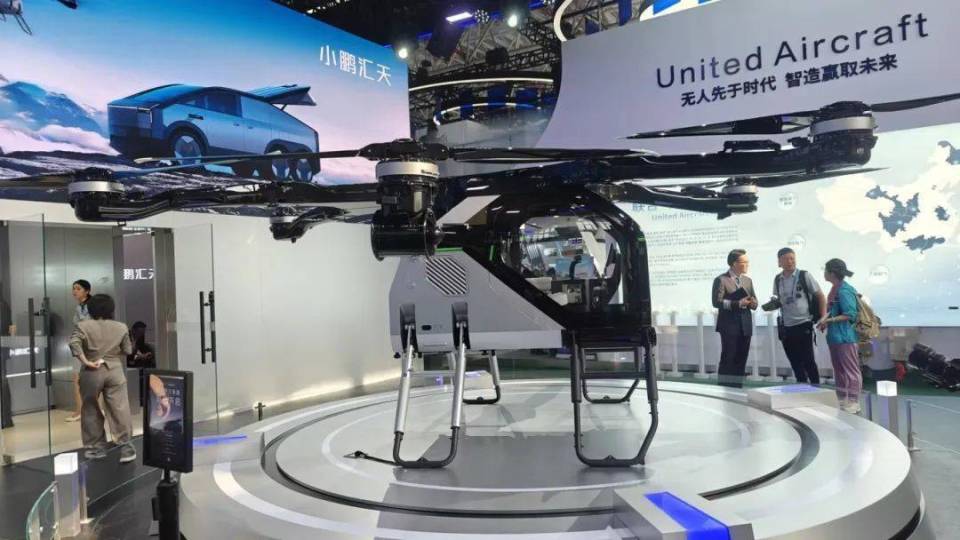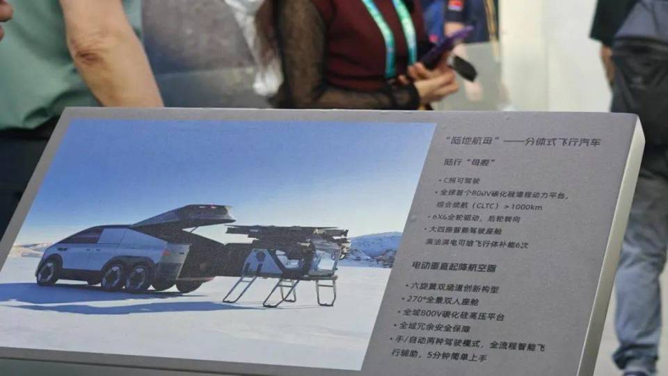 据参展商介绍,“陆地航母”是一款分体式飞行汽车,分为4座陆行“母舰”和六旋翼电动垂直起降飞行器(eVTOL)两部分。其中,eVTOL可载两人,并且有手动和自动两种驾驶模式。2023年,小鹏汇天“陆地航母”正式发布,目前已经获得了1.5亿美元的B1轮融资;eVTOL部分的研制工作已经进入中国民航局TPC认证过程。